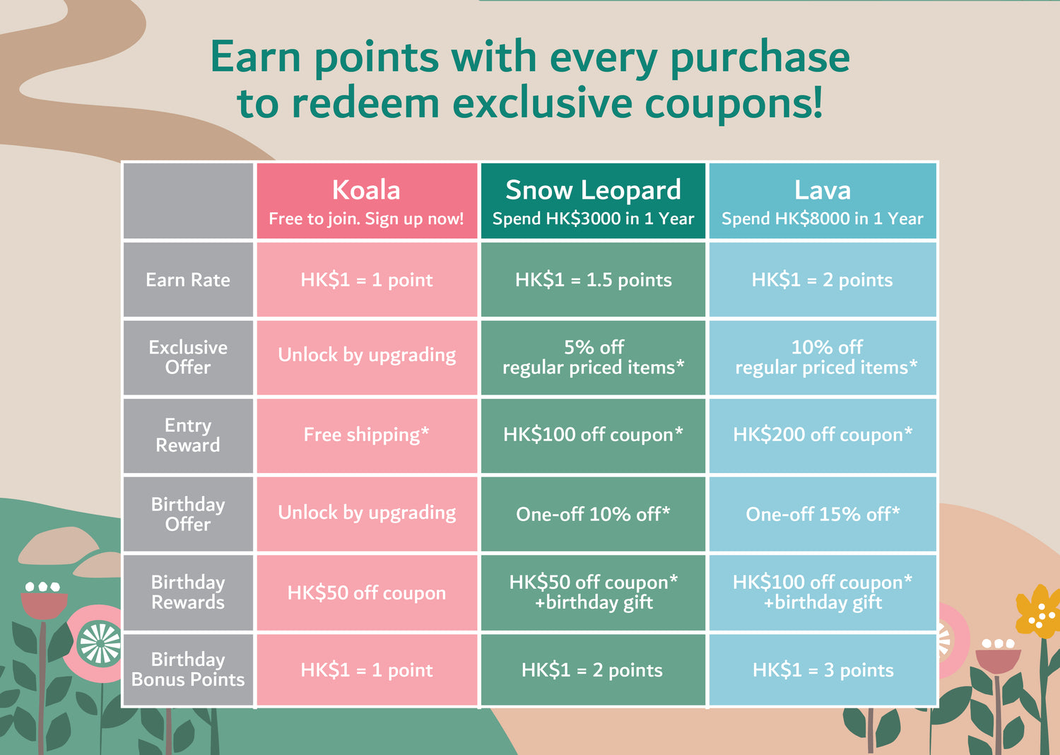 Earn points with every purchase and enjoy exclusive rewards, discounts, and birthday surprises.Spend more within 12 months to unlock higher tiers and even better perks.Points and benefits apply to online and in-store purchases only.