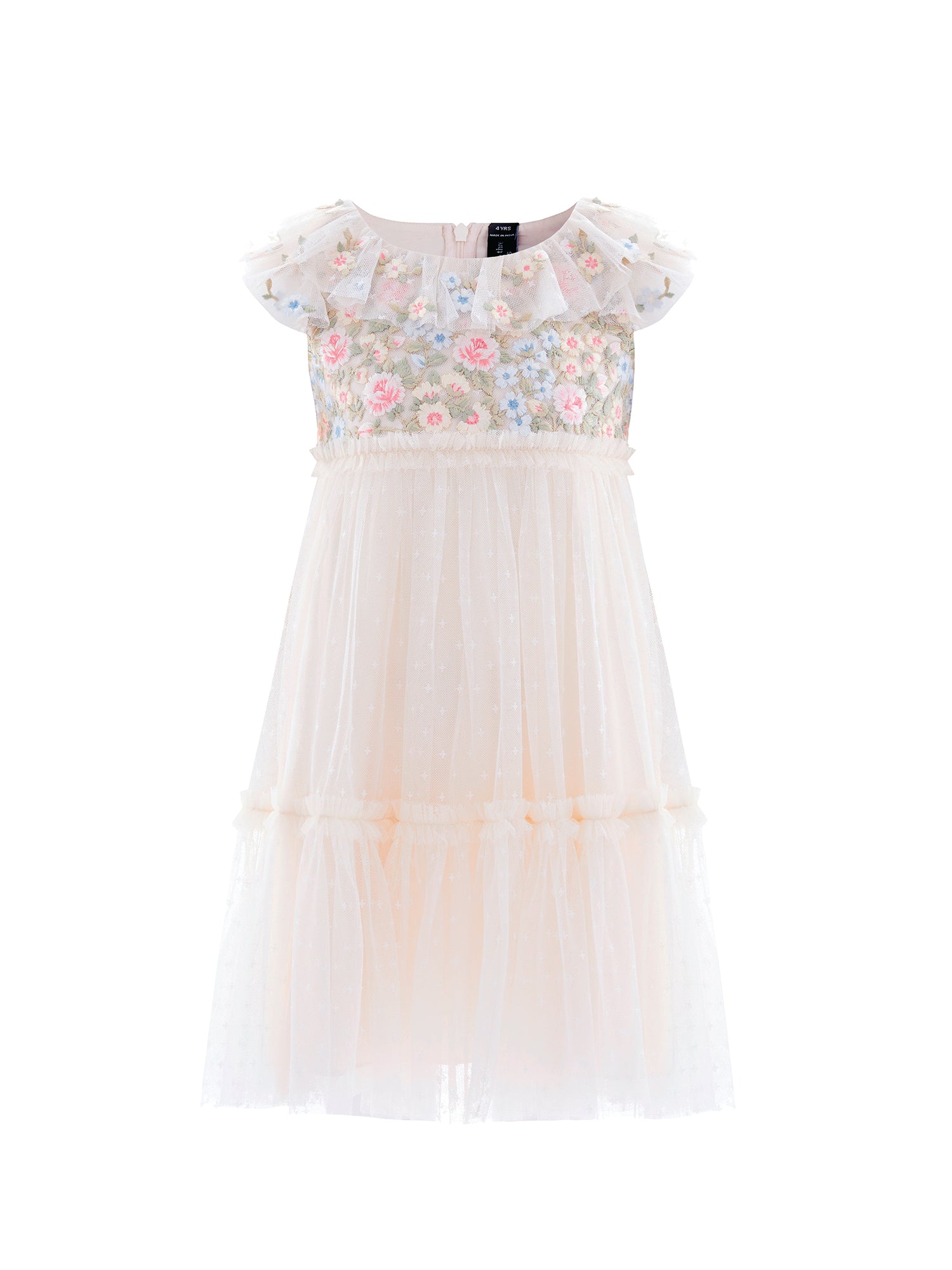 The Antoinettes Floral Bodice KIDS Dress in Cream. This enchanting dress features a beautifully embroidered bodice with multicoloured floral bouquets, inspired by the lavish interiors of Versailles. Tulle frill neckline and sleeves are dotted with ditsy floral motifs, while the softly gathered skirt tier adds volume for a twirl-worthy finish. The perfect dress for a special occasion, a charming flower girl moment, or simply for dressing up.
