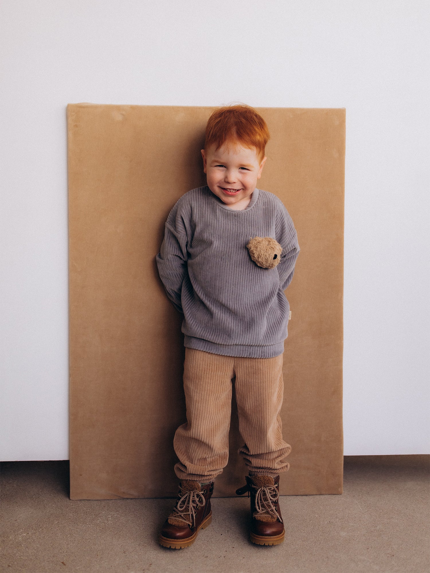These soft, stylish cord velour trousers are a must-have for your little one’s wardrobe. Made from high-quality, organic cotton. Perfect for everyday wear, the trousers offer both comfort and durability, making them ideal for active kids. Featuring an elastic waistband for easy dressing and a snug fit, these trousers are perfect for playdates, or relaxed weekends. Made with love in Latvia (EU).