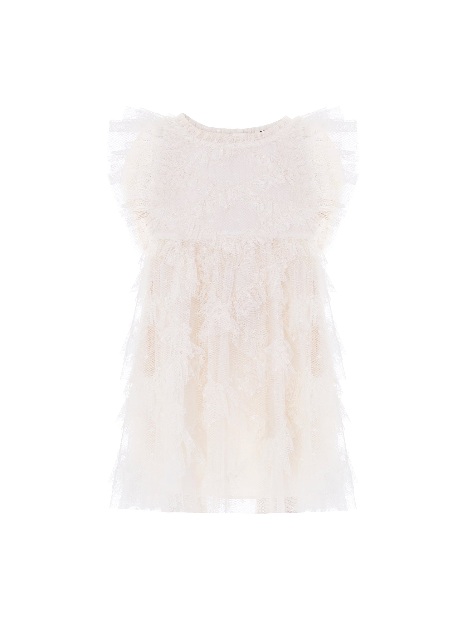 The dress has a flowing, tiered skirt that adds to the dreamy, romantic aesthetic. The overall design of the dress is feminine, elegant, and perfect for special occasions or formal events. The dress has a timeless, classic style that would make any young girl feel like a princess.,
