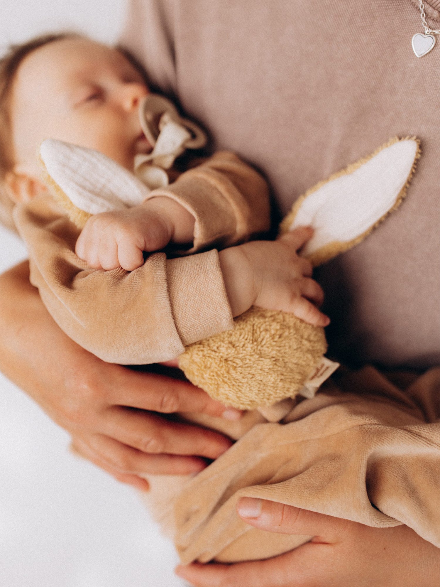 Shown resting beside light, neutral‑toned clothing, the plush piece lies naturally against soft bedding. The pacifier clip secures easily, keeping the pacifier within reach while offering a tactile companion.
