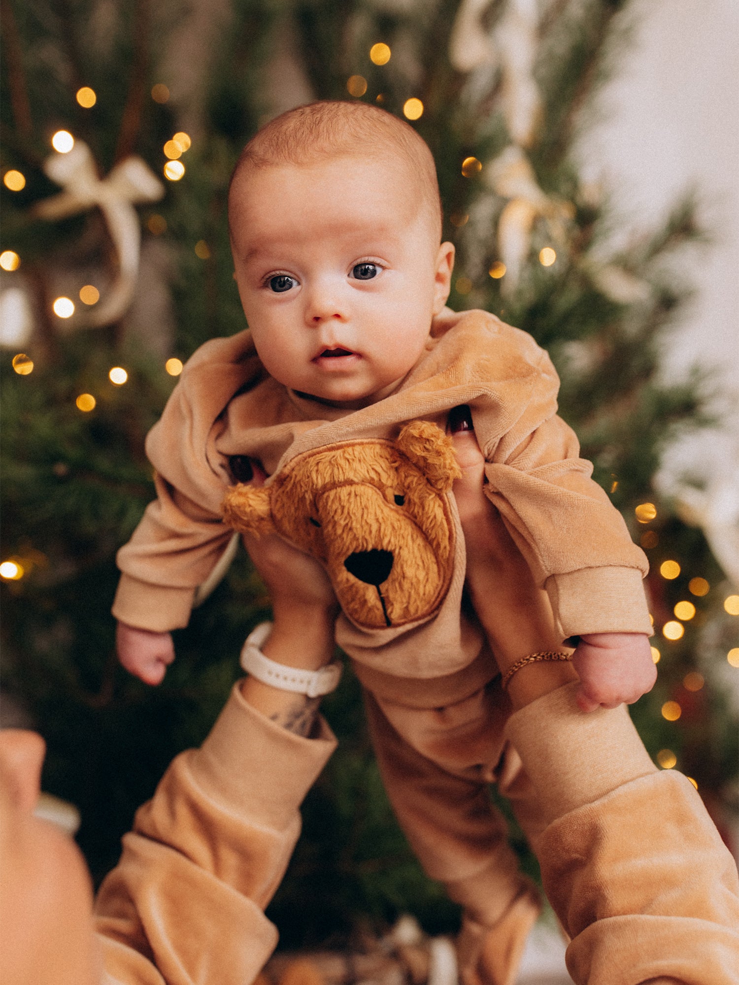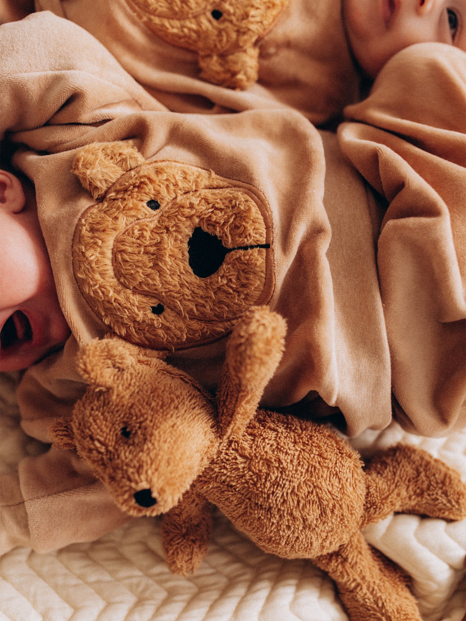 A soft beige sweater features a large textured teddy face embroidered at the center, adding a warm, playful focal point.