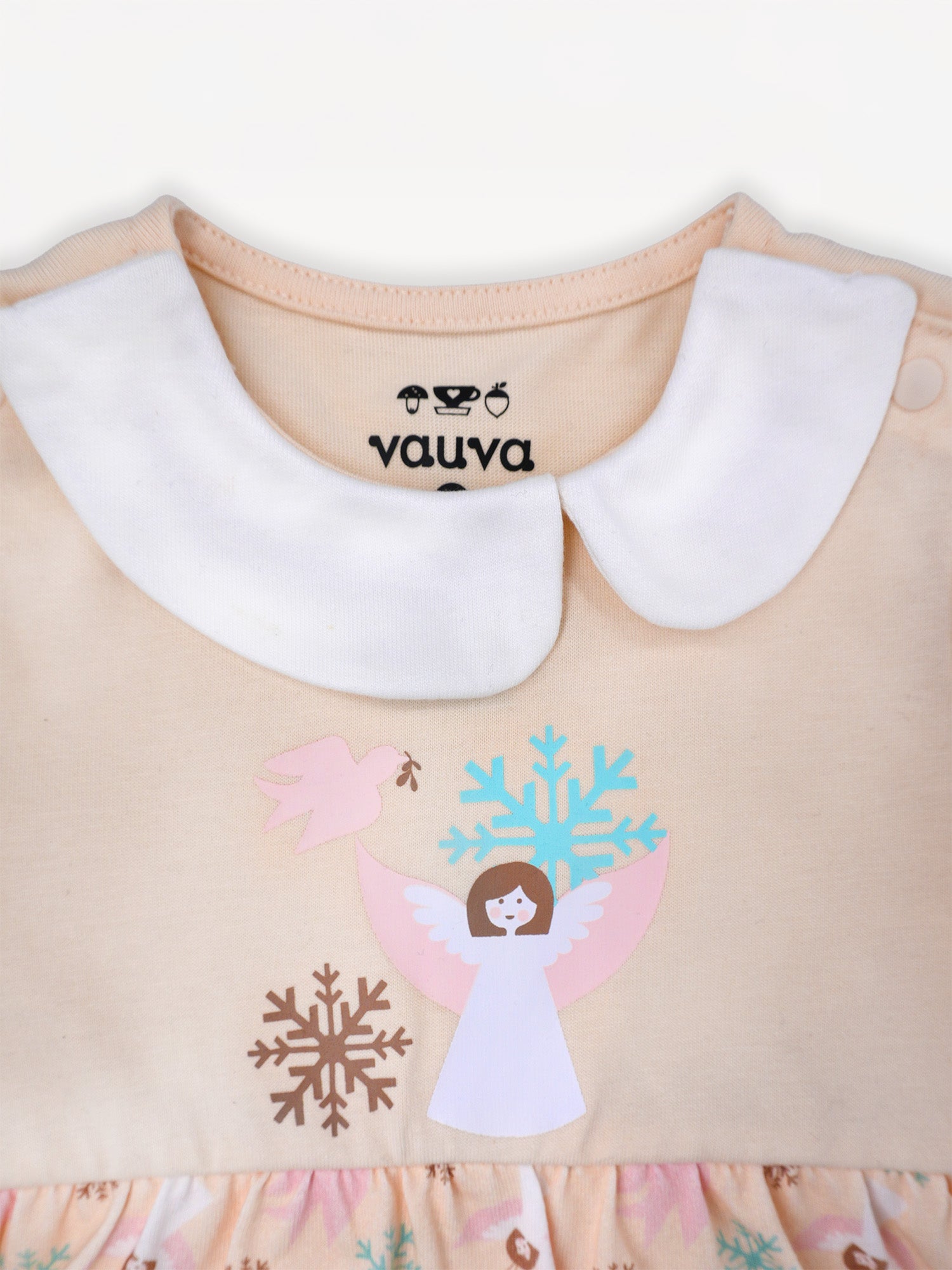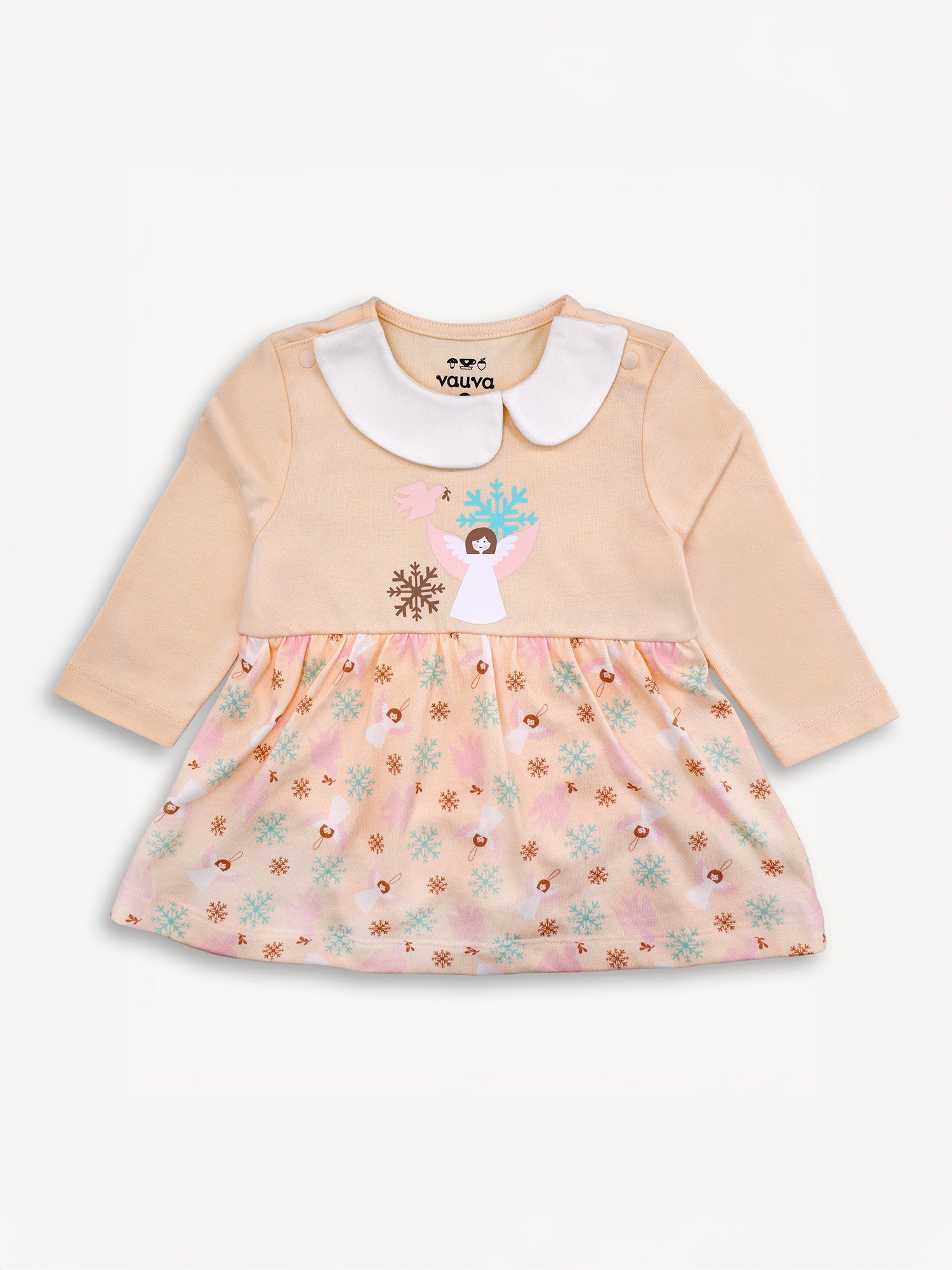 The Angel-Print Dress is designed for precious moments and everyday comfort. Made from 100% organic cotton, this dress is lightweight, breathable, and gentle on delicate skin. The classic doll collar adds a timeless, elegant touch, while the angel print brings a whimsical feel that's perfect for playdates, parties, or simply looking adorable. Best of all, it's machine washable, making it as practical as it is pretty.