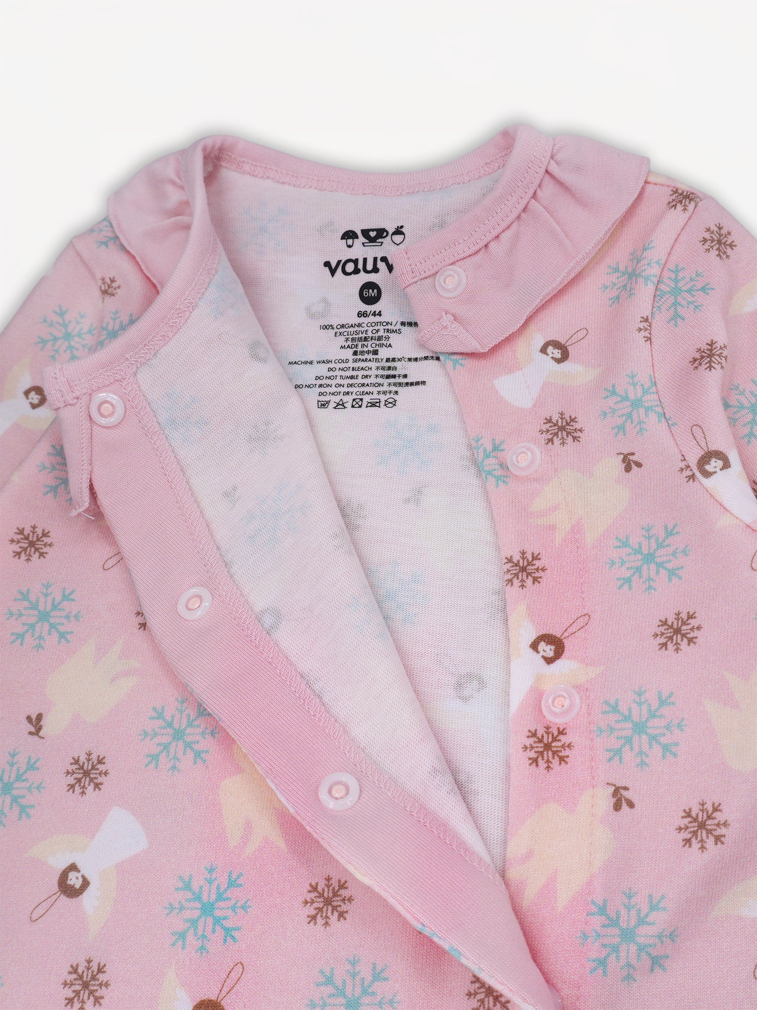 the Angel-Print Ruffle Collar Romper is a heavenly addition to your little one’s wardrobe. Crafted from 100% organic cotton, this romper is lightweight, breathable, and gentle on delicate skin, keeping your baby cozy and comfortable all day long. The charming ruffle collar adds a touch of timeless elegance, while the all-over angel print brings a whimsical, heartwarming feel. With easy snap buttons, dressing and diaper changes are quick and fuss-free. Perfect for playdates, photo ops, or just looking adorable.