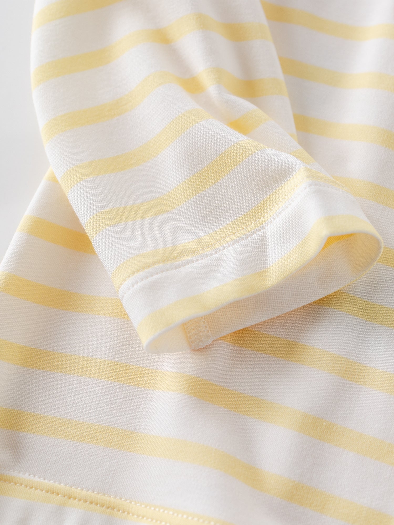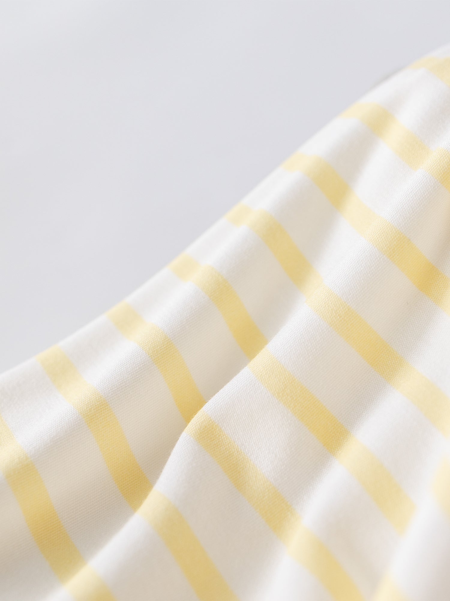 Features a long‑sleeve top and matching pants in soft pastel yellow tones.